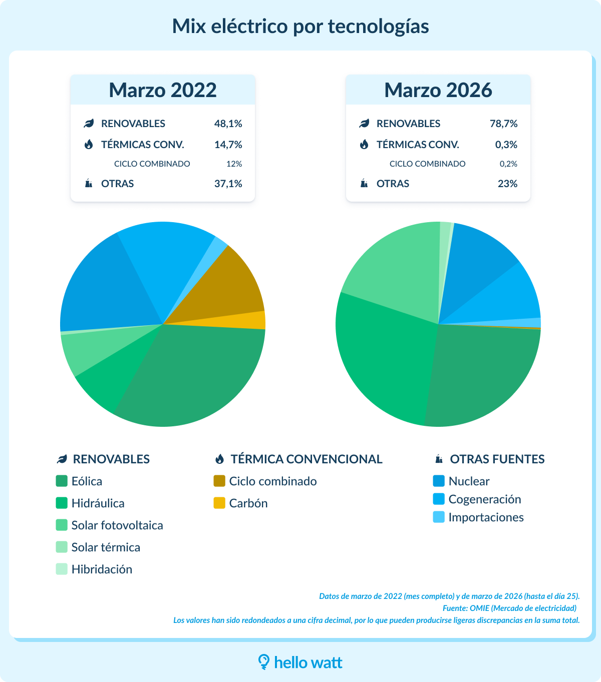 El cambio más relevante del sistema eléctrico español desde 2022 es la expansión de las energías renovables. Los datos de marzo de 2026, comparados con los de marzo de 2022, lo reflejan con claridad: