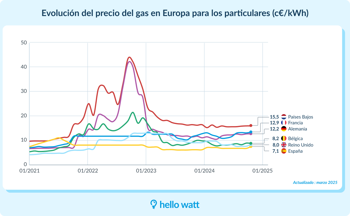 El precio del gas natural en España en el primer trimestre de 2026 para el peaje RL.1 (consumo bajo) tiene un precio de 0,04259 €/kWh en el término variable y 3,93 €/mes en el fijo, mientras que el RL.2 (consumo medio-alto) cuesta 0,04049 €/kWh y 8,11 €/mes, respectivamente. En el mercado regulado, la Tarifa de Último Recurso (TUR) tiene precios distintos según el tramo de consumo anual. Esos tramos coinciden con los peajes de acceso RL (RL.1, RL.2 y RL.3), asignados en función del consumo anual.. Resumen El precio final combina dos conceptos: el término fijo mensual (que pagas aunque no consumas) y el término variable por cada kWh usado, más impuestos. El Gobierno revisa los precios de la TUR cada tres meses (enero, abril, julio y octubre) según el mercado mayorista, garantizando transparencia. La distribuidora de gas te asigna el peaje RL.1, RL.2 o RL.3 según tu consumo histórico anual. No puedes elegirlo, pero sí puedes decidir si contratar la TUR (mercado regulado) o una tarifa del mercado libre para ese peaje. Evolución de la factura promedio del gas con TUR Resumen Mejores precios de tarifas de gas hoy (mercado libre) Precio del gas natural hoy Evolución reciente del precio del gas natural Preguntas frecuentes sobre el precio del gas natural Mejores precios de tarifas de gas hoy (mercado libre) En el mercado libre, las compañías ofrecen tarifas con condiciones distintas: Tarifa fija: el precio del kWh se mantiene fijo durante todo el período establecido en el contrato, independientemente de las variaciones del precio del kWh en el mercado regulado. Tarifa indexada: su precio varía según el mercado mayorista y puede incluir un margen fijo o un recargo sobre el consumo. Para el peaje RL.1, estos son los precios vigentes en enero de 2026 (sin impuestos): Top tarifas fijas (RL.1 / RL.2) Mejores precios de tarifas fijas con RL.1 Compañía Tarifa Término Fijo €/mes Término Variable €/kWh Gas 4,71 0,0620 Fácil Plus 7,31 0,0630 One Gas 6,83 0,0717 Tarifa RL.1, con un consumo anual menor de 5.000 kWh. Precios revisados en enero de 2026. No se incluyen impuestos. Mejores precios de tarifas fijas con RL.2 Compañía Tarifa Término Fijo €/mes Término Variable €/kWh Fácil Plus 10,88 0,0535 Gas 11,58 0,0580 One Gas 13,60 0,0686 Tarifa RL.2, con un consumo anual de entre 5.000 kWh a 15.000 kWh. Precios revisados en enero de 2026. No se incluyen impuestos. Top tarifas indexadas El precio del gas en el mercado libre varía según la comercializadora. Aquí te mostramos las tarifas indexadas para clientes con el peaje RL.2, la más común en hogares con un consumo anual de entre 5.000 y 15.000 kWh. Aunque también existen tarifas para los peajes de acceso RL.1, RL.3 y RL.4, te mostramos las opciones más económicas para un consumo estimado de 10.000 kWh, así podrás aprovechar todas las ventajas del gas natural. Compañía Peaje Tarifa Término Fijo €/mes Término Variable €/kWh RL.2 Tendencia Gas 9,31 0,0513 RL.2 Variable 14,00 0,0513 RL.2 Precio Mercado 8,11 0,0573 Tarifa RL.2, con un consumo anual de entre 5.000 kWh a 15.000 kWh. Precios revisados en enero de 2026. No se incluyen impuestos. Precio del gas natural hoy Como hemos mencionado antes, el precio del gas natural en España se determina según el mercado regulado (TUR) o el mercado libre. La TUR se compone de tres peajes de acceso — RL.1, RL.2 y RL.3 — que varían en función del consumo anual. A continuación, encontrarás un resumen con los precios vigentes, sin impuestos. TUR vigente (RL.1, RL.2, RL.3): términos fijo y variable, sin impuestos Tarifa Término fijo (€/mes) Término variable (€/kWh) TUR RL.1 3,93 0,04259 TUR RL.2 8,11 0,04049 TUR RL.3 18,82 0,03705 Precios disponibles de enero a marzo de 2026, no incluyen impuestos. ¿Qué tarifa elijo? Compara ahora mismo las mejores tarifas de luz y gas con Hello Watt. ¡Y gratis! ¡Compara! ¿Cuándo y cómo se actualiza la TUR? La TUR se revisa cada tres meses: enero, abril, julio y octubre. El Gobierno, a través de la CNMC y el Ministerio para la Transición Ecológica, fija los precios en función del mercado mayorista del gas. El precio es siempre el mismo en todas las comercializadoras de referencia. ¿Qué TUR me corresponde? (reglas RL.1/RL.2/RL.3 + casos de uso) La Tarifa de Último Recurso (TUR) de gas y los peajes de acceso no son lo mismo, pero están intrínsecamente conectados: la TUR es un precio regulado para el gas ofrecido por comercializadoras de referencia, mientras que los peajes son los costes regulados por el uso de la red de distribución de gas, que se incluyen dentro del cálculo final de la factura de la TUR (y otras tarifas). Los peajes (RL.1, RL.2, RL.3) determinan el tipo de tarifa TUR que puedes contratar según tu consumo: RL.1: hasta 5.000 kWh/año, pensada para viviendas sin calefacción a gas, pero con cocina y agua caliente sanitaria. RL.2: entre 5.000 y 15.000 kWh/año, habitual en hogares con calefacción de gas natural. RL.3: entre 15.000 y 50.000 kWh/año, propia de comunidades de vecinos o viviendas unifamiliares grandes. Si el consumo supera los 50.000 kWh/año, el usuario no puede acogerse a la TUR y debe contratar una tarifa en el mercado libre. Evolución reciente del precio del gas natural Entre 2021 y 2026 el gas natural experimentó fuertes variaciones: subidas en 2022, una corrección en 2023, una estabilización en 2024 y en 2025, a causa del apagón de abril, el gas fue más utilizado. En 2026, los precios de la TUR muestran niveles más bajos que en los años de crisis energética. ¿Cómo ha cambiado el precio del gas en los últimos años (2021-2026)? Los factores que impulsaron estas variaciones fueron la guerra de Ucrania, la situación con Argelia y la demanda energética tras la pandemia. Desde 2023, los precios han tendido a moderarse. Otros factores que inciden en el precio del gas Tipo de vivienda Zona fría (invierno largo, temperaturas bajas) Zona templada (inviernos 