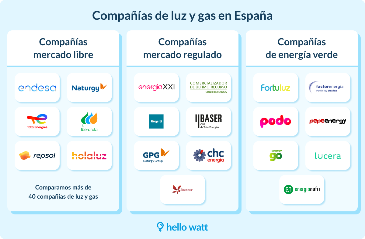Contratar la luz es un trámite sencillo El proceso para contratar luz en España es más simple de lo que parece. Conocer las diferentes opciones disponibles te permitirá encontrar la compañía de luz más barata y la que mejor se adapte a tus necesidades. Tanto si buscas dar de alta por primera vez, cambiar tu compañía o simplemente entender la diferencia entre potencia y energía, esta guía te ayudará a tomar la mejor decisión. ¿Cuáles son las diferentes tarifas de luz? En España existen dos mercados eléctricos: el mercado libre y el mercado regulado cada uno con particularidades en cuanto a tarifas, potencia contratada y consumo. En este contexto, entender cómo funcionan estos mercados y sus tarifas es esencial para tomar una decisión informada sobre tu suministro eléctrico. Antes de contratar tu suministro o cambiar tu compañía de luz, es fundamental conocer los tipos de tarifas disponibles para elegir la que mejor se adapte a tu perfil de consumo. El precio del kWh varía según la tarifa elegida, lo que puede impactar directamente en tu factura mensual. Una opción sostenible Si te preocupa el medio ambiente, puedes optar por contratar luz ecológica, es decir, electricidad de origen 100% renovable. Proviene de fuentes como la solar, eólica, hidráulica o biomasa, lo que reduce significativamente la huella de carbono y fomenta un consumo energético más sostenible. Tarifas con precio fijo Las tarifas de precio fijo garantizan un coste estable del kWh durante todo el contrato, sin verse afectadas por las fluctuaciones del mercado energético. Esta opción brinda mayor tranquilidad y previsibilidad en los gastos, ya que permite mantener una factura mensual estable. Estas tarifas protegen ante subidas de precios y facilitan la contratación online, además de ofrecer la posibilidad de combinar luz y gas en un mismo contrato. No obstante, no permiten aprovechar bajadas de precios y pueden incluir compromisos de permanencia o un coste inicial más alto. Son ideales para quienes buscan evitar cambios en el precio de la energía y prefieren estabilidad en sus pagos. A continuación, te dejamos el top 3 de las mejores tarifas fijas: Compañía Tarifa Término de Energía €/kWh Término de Potencia €/kW/mes Octopus Energy Octopus Relax 0,1220 P1: 2,9100 P2: 0,8100 TotalEnergies A tu aire siempre 0,1099 P1: 4,7075 P2: 0,0000 Plenitude Fácil Luz 0,1009 P1: 2,6858 P2: 2,6858 Término de energía: Precio las 24 horas del día, Término de potencia: P1 (Punta), P2 (Valle). Precios observados en febrero de 2026. No se incluyen impuestos. Tarifas con discriminación horaria La discriminación horaria establece diferentes precios para el kWh según el momento del día en que se realice el consumo. Estas tarifas dividen el día en tres franjas horarias: valle, llano y punta, lo que permite ajustar los hábitos de consumo para maximizar el ahorro en la factura de la luz. Cada una de estas franjas tiene un precio distinto por kWh y se distribuyen de la siguiente forma: Periodo valle: el más económico, que abarca desde las 00:00 hasta las 08:00, además de los fines de semana y festivos. Periodo llano: de 08:00 a 10:00, de 14:00 a 18:00 y de 22:00 a 00:00, con un precio intermedio. Periodo punta: el más caro, de 10:00 a 14:00 y de 18:00 a 22:00. Aquí te presentamos las tres mejores tarifas de luz con discriminación horaria: Compañía Tarifa Término de Energía €/kWh Término de Potencia €/kW/mes Octopus Energy Octopus 3 P1: 0,1950 P2: 0,1160 P3: 0,0850 P1: 2,9100 P2: 0,8100 TotalEnergies Programa tu Ahorro P1: 0,1736 P2: 0,1039 P3: 0,0762 P1: 2,3533 P2: 2,3542 Iberdrola Plan Online 3 Periodos P1: 0,1917 P2: 0,1334 P3: 0,0996 P1: 2,7322 P2: 0,4045 Término de energía: P1 (Punta), P2 (Llana), P3 (Valle). Término de potencia: P1 (Punta), P2 (Valle). Precios observados en febrero de 2026. No se incluyen impuestos. Tarifas indexadas Las tarifas indexadas ajustan el precio del kWh según el mercado mayorista (OMIE), lo que permite pagar menos en horas de baja demanda, como noches y fines de semana. La potencia contratada es fija, pero el coste del consumo varía, ofreciendo oportunidades de ahorro para quienes pueden adaptar su consumo. Sus ventajas incluyen transparencia, ausencia de permanencia y precios competitivos en ciertos momentos. Sin embargo, presentan mayor volatilidad, requieren monitoreo constante y pueden encarecerse en periodos de crisis. Son ideales para usuarios con flexibilidad horaria. Estos son los precios promedio del mes anterior para el término de la energía en cada tramo horario: punta ( 0,2317 ); llano ( 0,1374 ) y valle ( 0,1192 ). A continuación, te mostramos las mejores tarifas de luz indexada: Compañía Tarifa Término de Potencia €/kW/mes Coste de Gestión €/mes Gana Energía Precio Mercado P1: 2,2771 P2: 0,0596 5,01 Octopus Energy Octopus Flexi P1: 2,2800 P2: 0,0600 3,75 Plenitude Tendencia Luz P1: 2,2771 P2: 0,0596 3,50 Término de potencia: P1 (Punta), P2 (Valle) sin impuestos + Cuota administrativa mensual con impuestos incluidos. Precios observados en febrero de 2026. Información La Red Eléctrica Española (REE) es clave en el sistema, ya que opera y transporta la electricidad en alta tensión, asegurando el equilibrio entre producción y consumo a través de una red de más de 44.000 km. Requisitos y costes para dar de alta la luz Si necesitas dar de alta tu suministro eléctrico o cambiar de titularidad, el proceso es sencillo y cada vez más ágil, especialmente si lo haces online. Podrás elegir la tarifa y la potencia que mejor se adapten a tu consumo, teniendo en cuenta que el coste del kWh será un factor clave en tu decisión. A continuación, te detallamos todo lo necesario para activar el suministro eléctrico en una vivienda: los pasos del proceso, el coste aproximado y la documentación requerida. Esta guía es válida tanto para viviendas de obra nueva como para aquellas donde se haya dado de baja la luz anteriorme